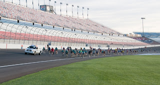 We yelp and yowl as we ride through the tunnel into the speedway. We’re on our way! The empty seats around the track are multi-colored and give the illusion that a crowd is watching us. Maybe there is a crowd watching us. We line up at the start line, leaning on our right feet into the incline of the track. I look around to find other members of my team scattered in little groups, wearing their blue and green BikingLasVegas.com jerseys. We push off slowly and come to the first turn. That’s when I understand why some people didn’t want to ride on the track. It slopes up sideways to what seems to be at least three stories high at a 45 degree angle. I’m in the middle with riders above me and below. It is a strange place to be riding a bike, angled so steeply into the road just to stay up straight, but I’m thrilled to be here. Still, this would not be a good place to crash (not that any place would be good for a crash).
