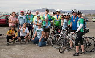 I recognize a couple of my team mates in their blue and green BikingLasVegas.com jerseys. Colleen is there too, and fills one of my water bottles with a specially formulated nutrient powder for long rides. I shed my long-sleeve shirt, knowing it will be too hot later. I wait a while as the rest of my team arrives. We pull out together, 17 in all, forming a double paceline on the road to Valley of Fire State Park. It lasts for a few miles, us talking and really enjoying the ride, before two guys pull away up front and most of the rest fall back behind.