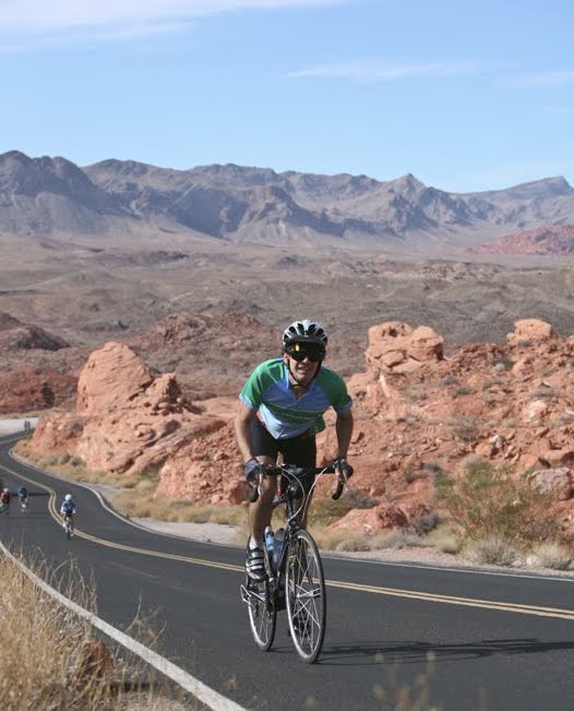 Our route will take us around past Apex, up to the Great Basin Highway, onto I 15, through Valley of Fire State Park, north through Overton and Logandale, back onto I 15, and north/east to Mesquite, Nevada, approximately 98.5 miles. The return tomorrow will take us directly back to the speedway along I 15, approximately 69 miles. I don’t think about all this. For me, it’s one curve or one hill at a time. Our first hill gets my legs going. I am immediately pleased to find I’m climbing strong, keeping up with the type of riders who would usually “drop” me. The hill is no problem. Maybe I should slow down, I think. Am I pushing too hard? My heart rate is fine, not even 140 beats per minute.
