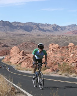 I recognize a couple of my team mates in their blue and green BikingLasVegas.com jerseys. Colleen is there too, and fills one of my water bottles with a specially formulated nutrient powder for long rides. I shed my long-sleeve shirt, knowing it will be too hot later. I wait a while as the rest of my team arrives. We pull out together, 17 in all, forming a double paceline on the road to Valley of Fire State Park. It lasts for a few miles, us talking and really enjoying the ride, before two guys pull away up front and most of the rest fall back behind.