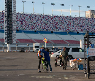 This happened to be the same weekend as the air show at Nellis Air Force Base, which is very close to the speedway. They were only allowing parking at the speedway and were bussing spectators to the base. Parts of Las Vegas Boulevard were closed because of this as I approached the speedway completely alone. On the boulevard, I navigated around two police cars in the middle of the road and up to a group of turning busses, where I was told to turn with the busses, then head toward the entrance tunnel to the speedway. That was the tunnel we had ridden through to start our ride less than 32 hours earlier, just after doing one lap around the speedway. We had exited as a long group of 217 riders, and now I was coming in solo.